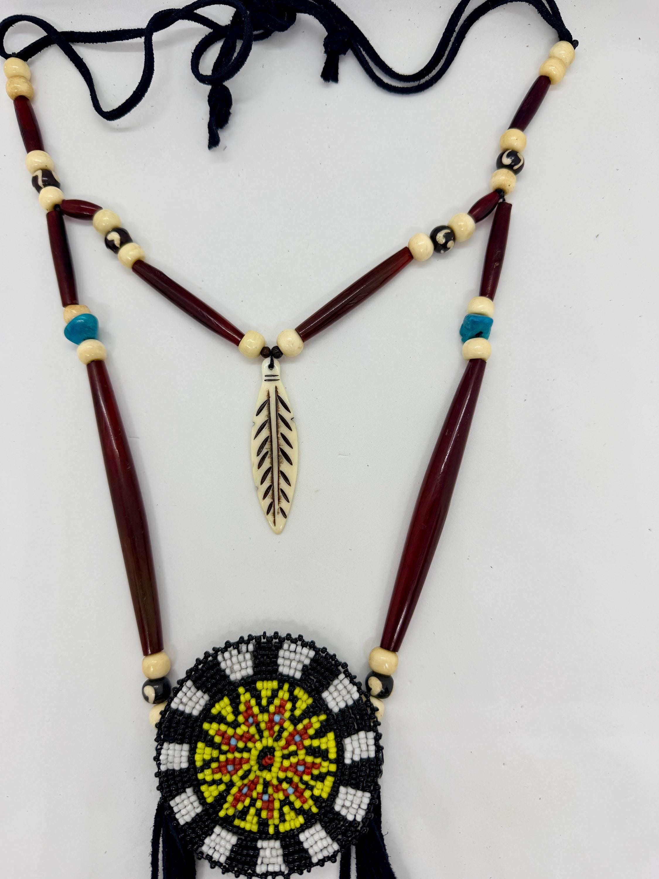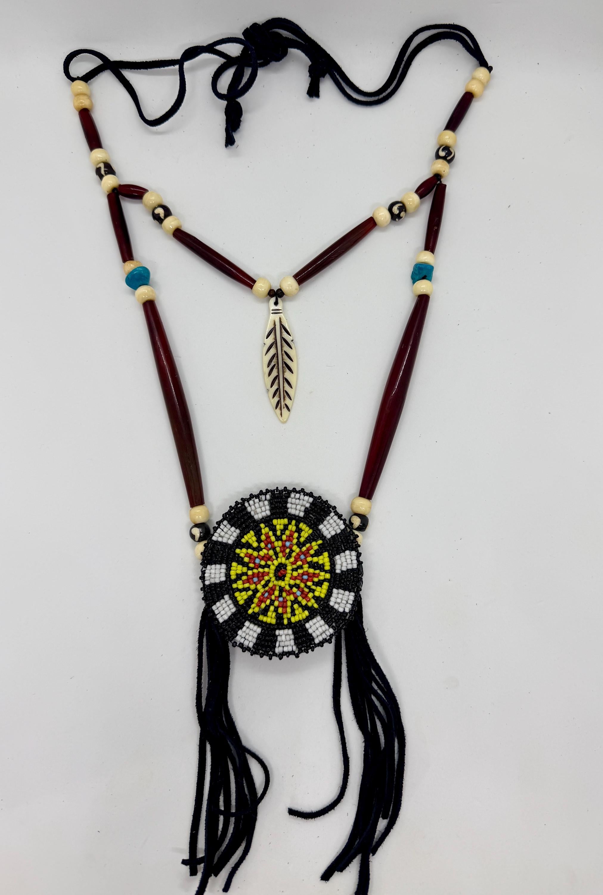 Authentic Native American beaded medallion necklace. This necklace is made with buffalo horn hair pipe beads, buffalo bone beads, glass beadwork, and buckskin leather. Length of necklace is adjustable with tie.