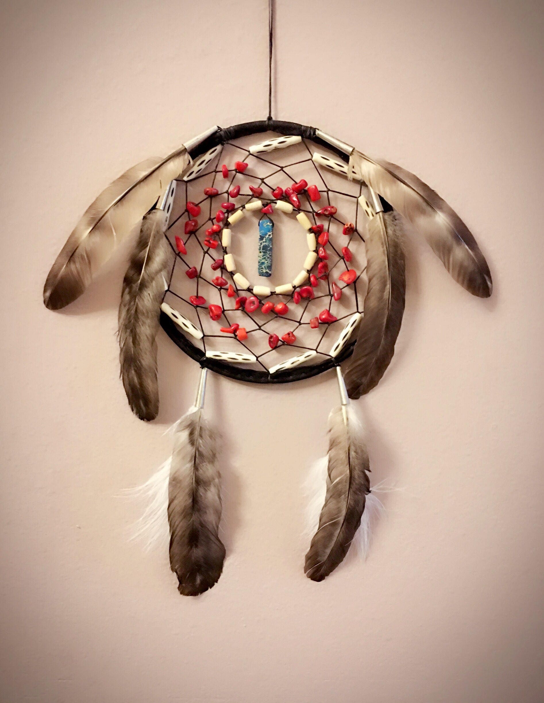 Authentic Native American dream catcher. Made with sage blessed buckskin, hand carved buffalo bone beads, red coral, an imperial jasper pendant, and cruelty free feathers.
