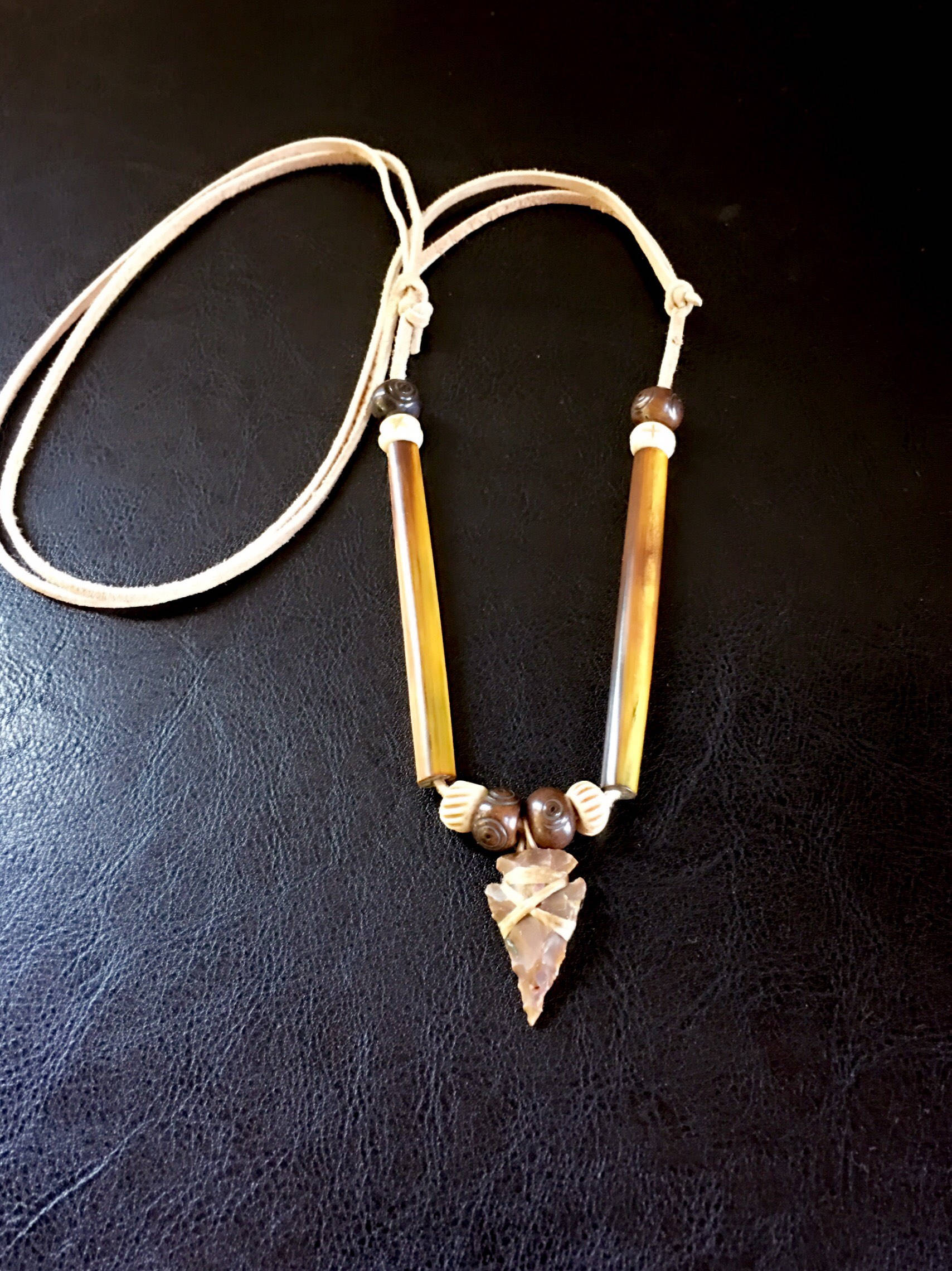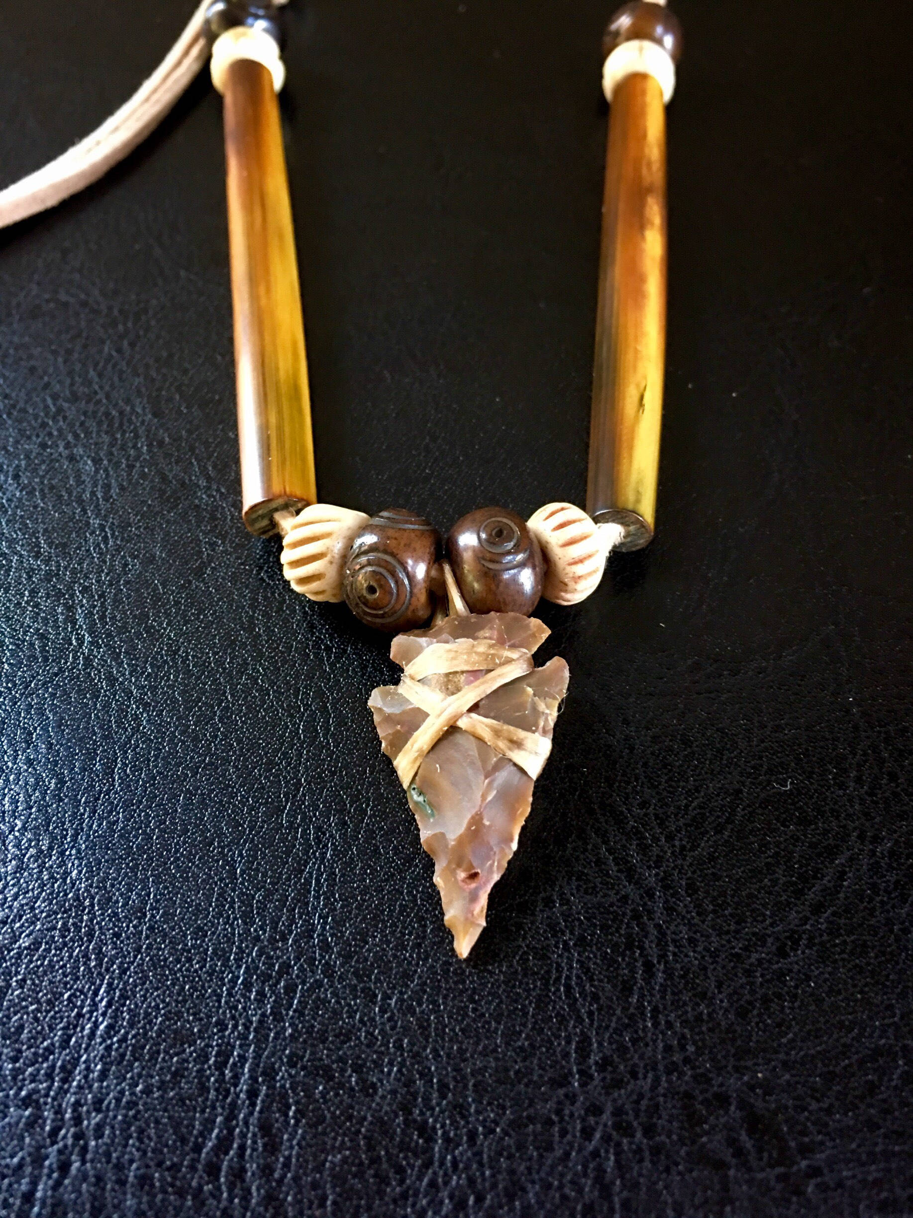 Authentic Native American arrowhead necklace. Made with a hand knapped agate arrowhead and hand carved Buffalo bone beads on a buckskin leather lace. Adjustable sizing with sliding knots. All materials are from cruelty free sources and are sage blessed.
