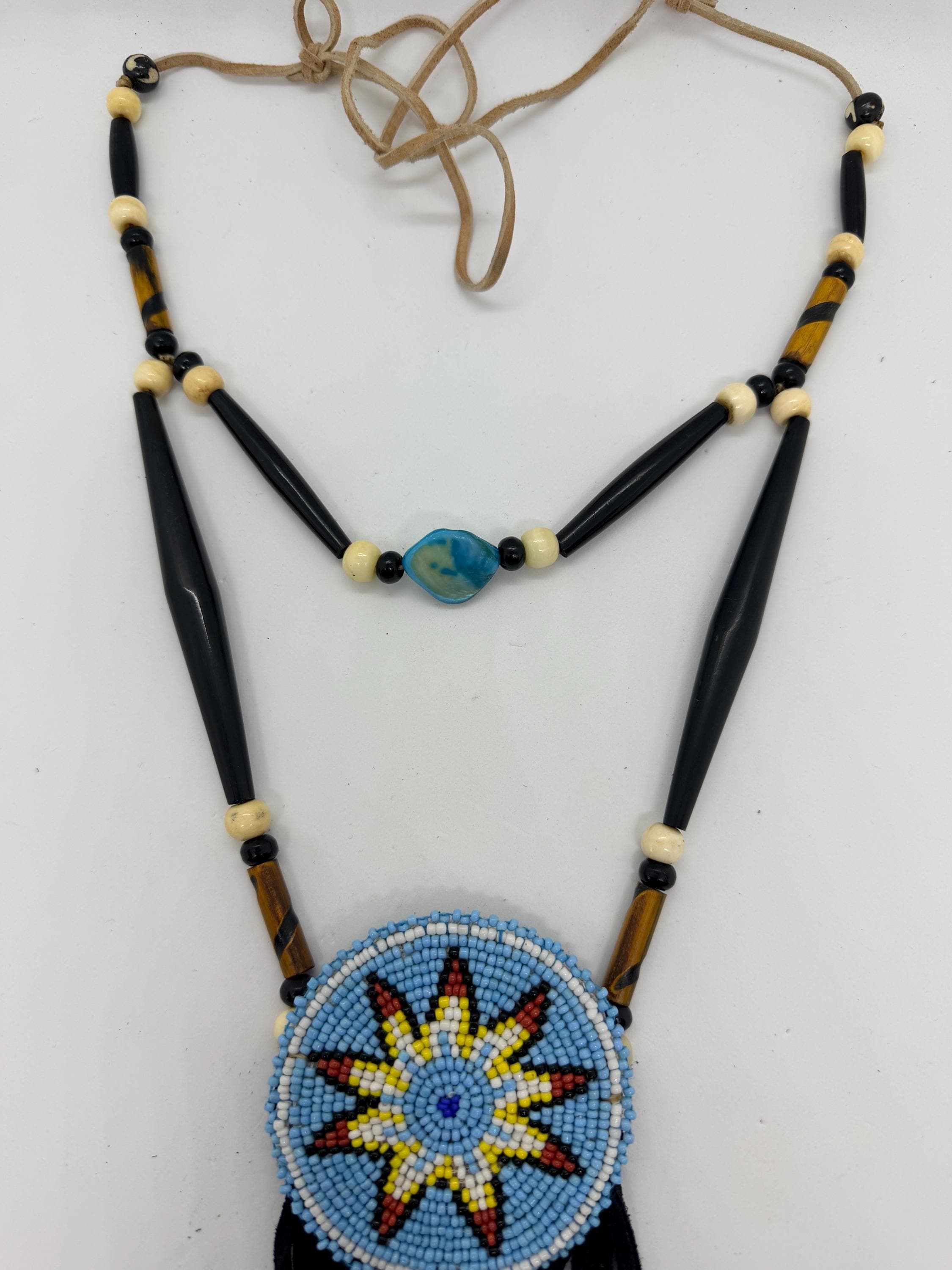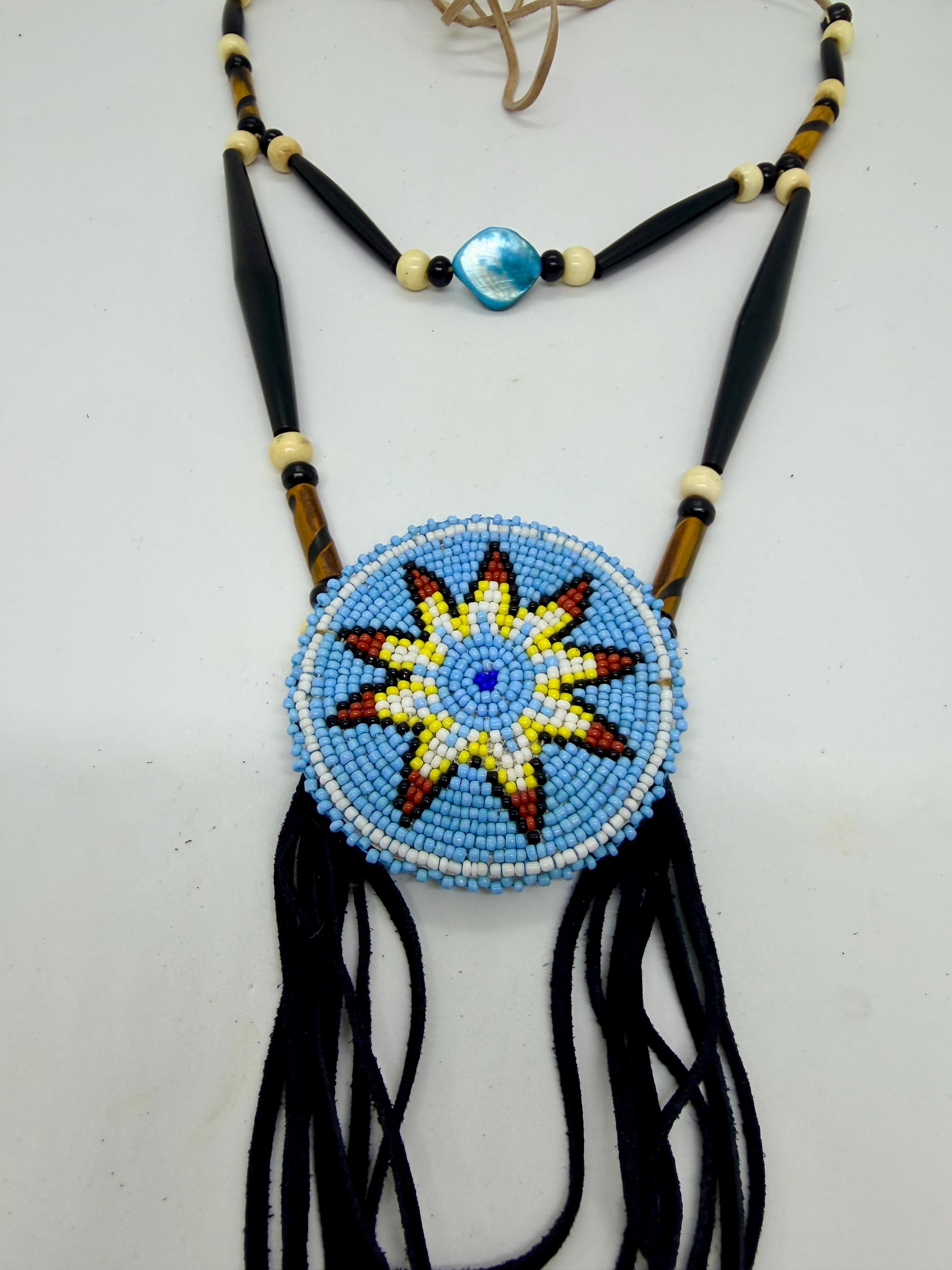 Authentic Native American beaded medallion necklace. This necklace is made with buffalo horn hair pipe beads, buffalo bone beads, glass beadwork, and leather. Length of necklace is adjustable.