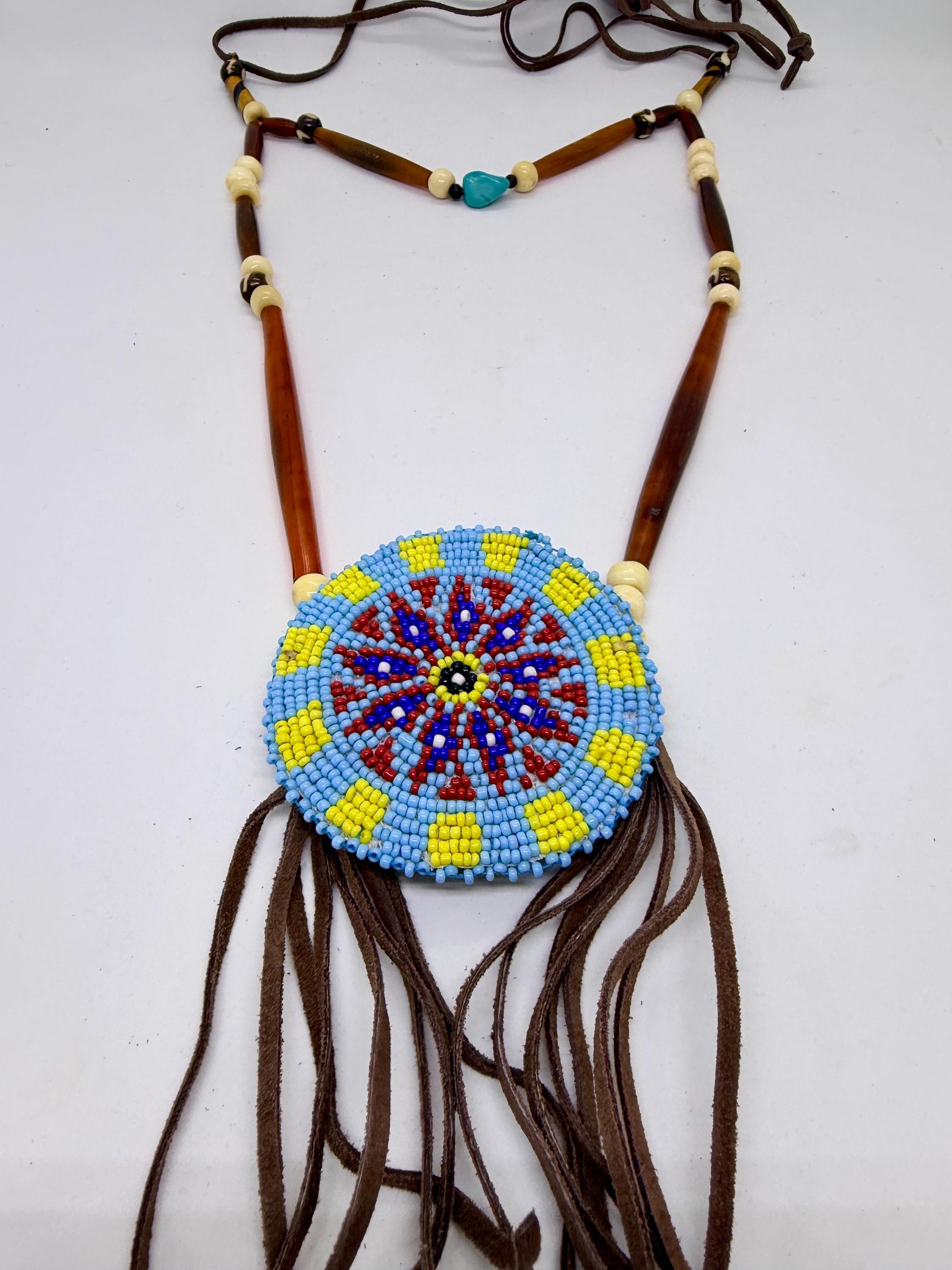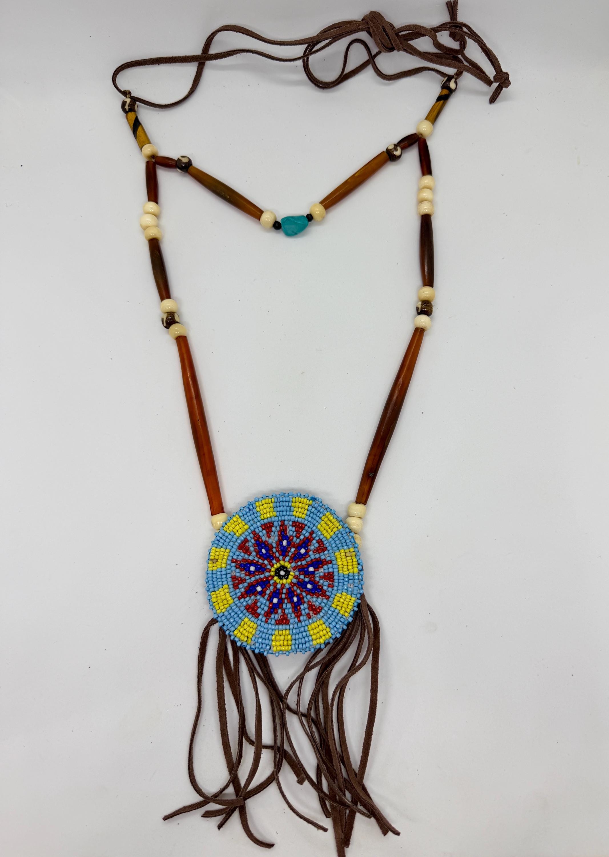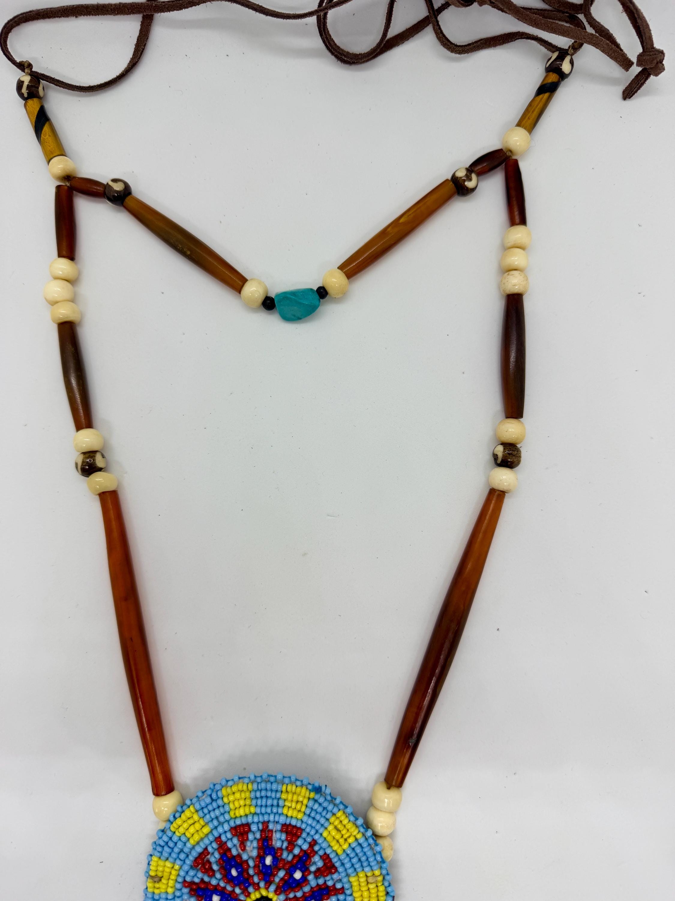 Authentic Native American beaded medallion necklace. This necklace is a breastplate style made with buffalo horn hair pipe beads, buffalo bone beads, turquoise beads, glass beadwork, and leather. Length of necklace is adjustable with slide knots.