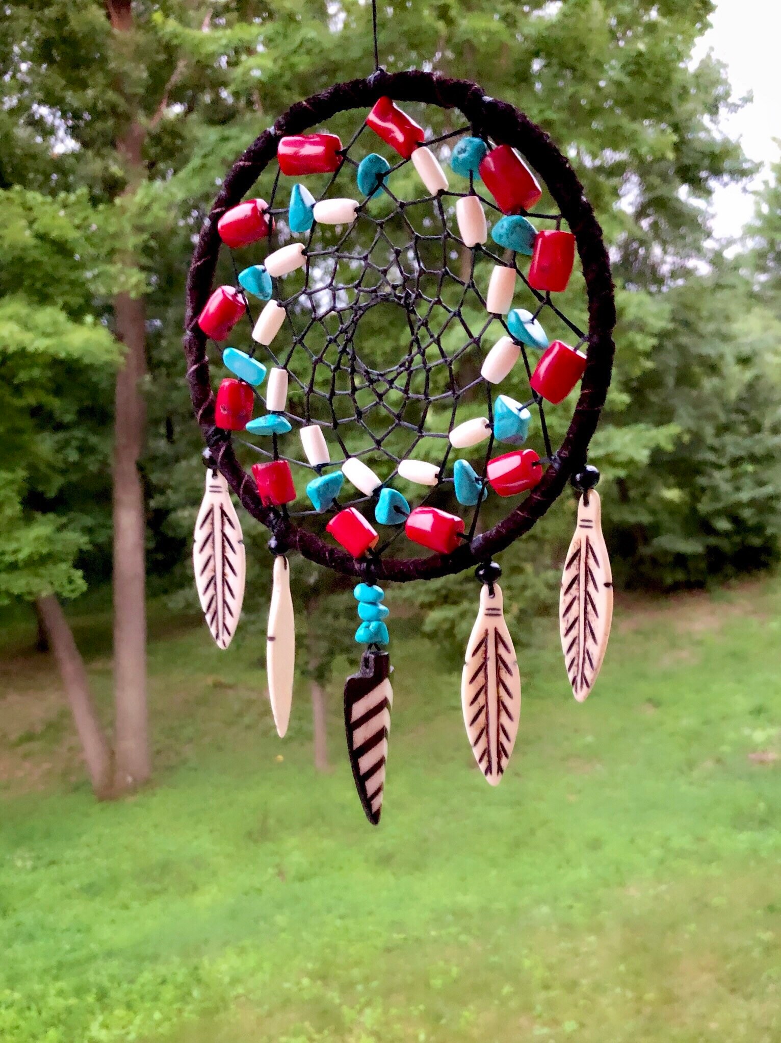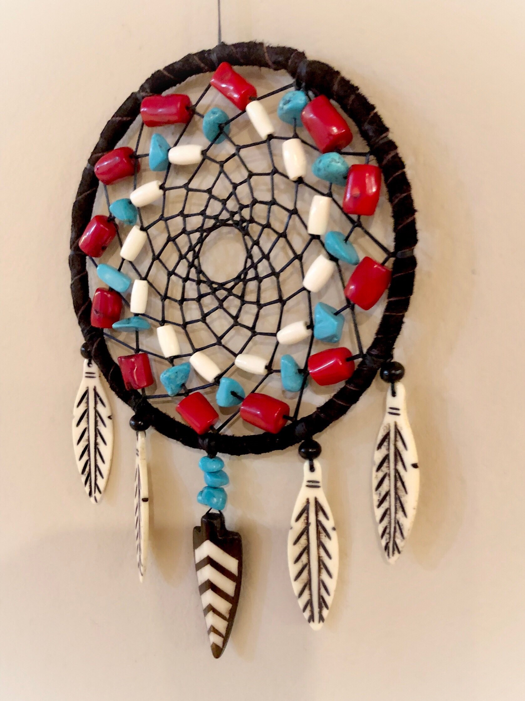 Authentic Native American dreamcatcher. Made with smoked buckskin, turquoise, buffalo bone beads, buffalo horn beads, and buffalo bone hand carved feathers.