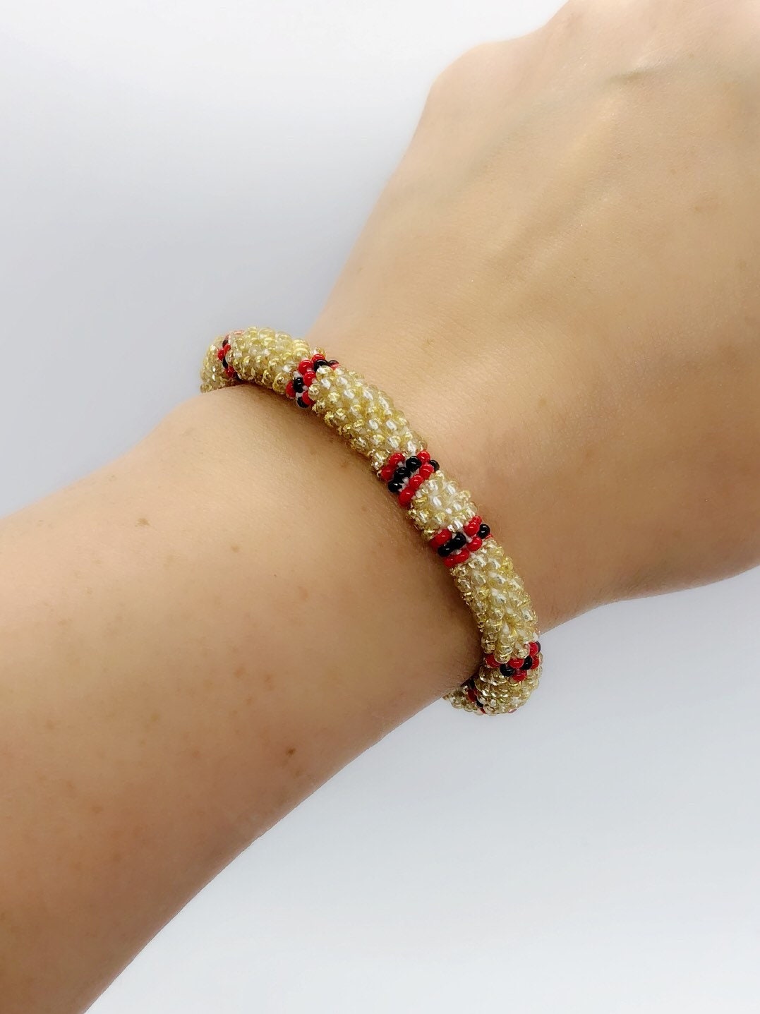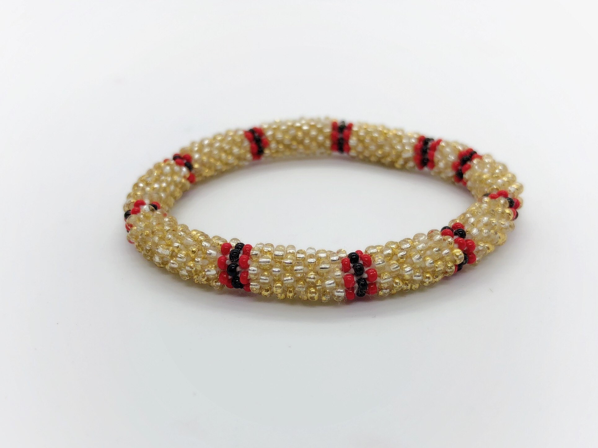 Handmade beaded roll on bracelet. Made with glass beads and cotton thread. This bracelet is approximately 7” in beaded length but the cotton has give to it so it can fit up to an 8.5” wrist. Beaded one by one in a crochet style with an elastic core to keep its shape.