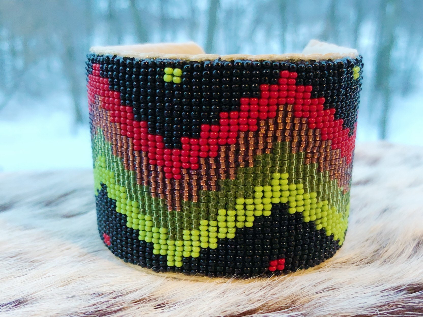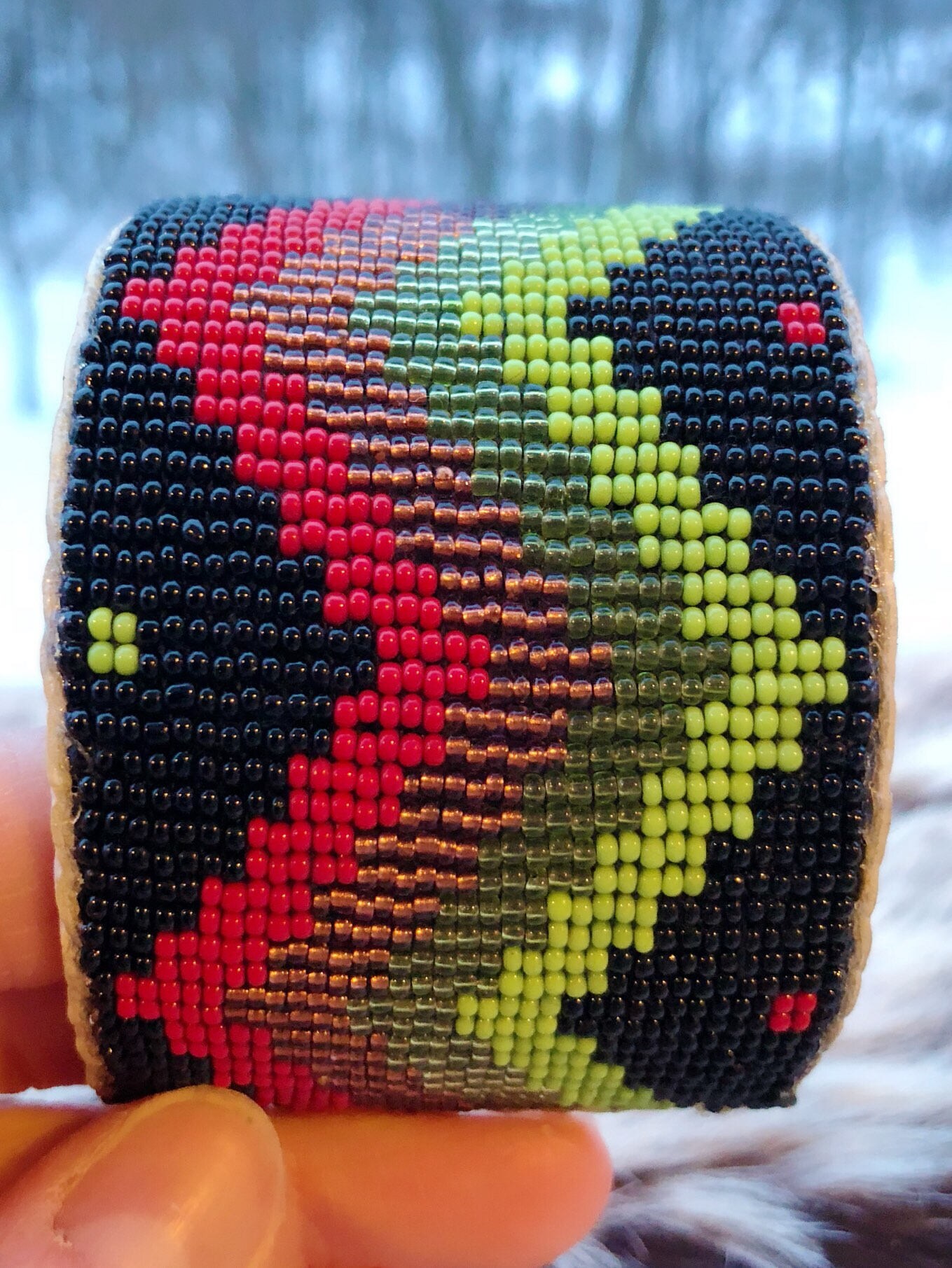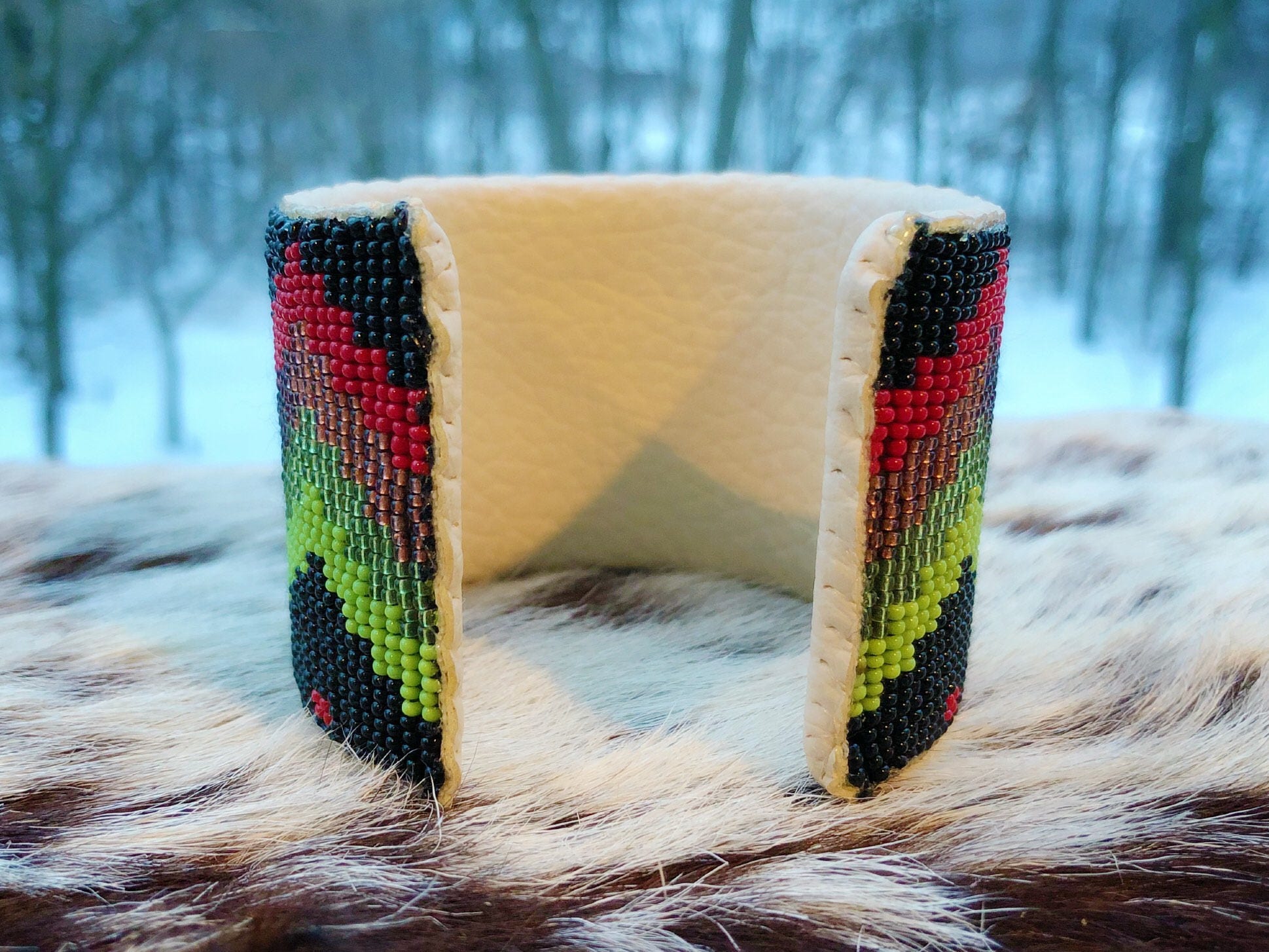 Native American beaded cuff. Lightening/Father Sky design. This cuff bracelet is made of glass beads and buckskin over a bendable shapable metal cuff. Beaded length is 8”, width is 2.25”.