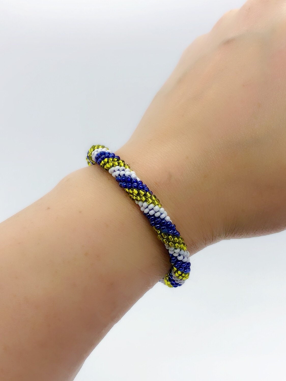 Handmade beaded roll on bracelet. Made with glass beads and cotton thread. This bracelet is approximately 7” in beaded length but the cotton has give to it so it can fit up to an 8.5” wrist. Beaded one by one in a crochet style with an elastic core to keep its shape.