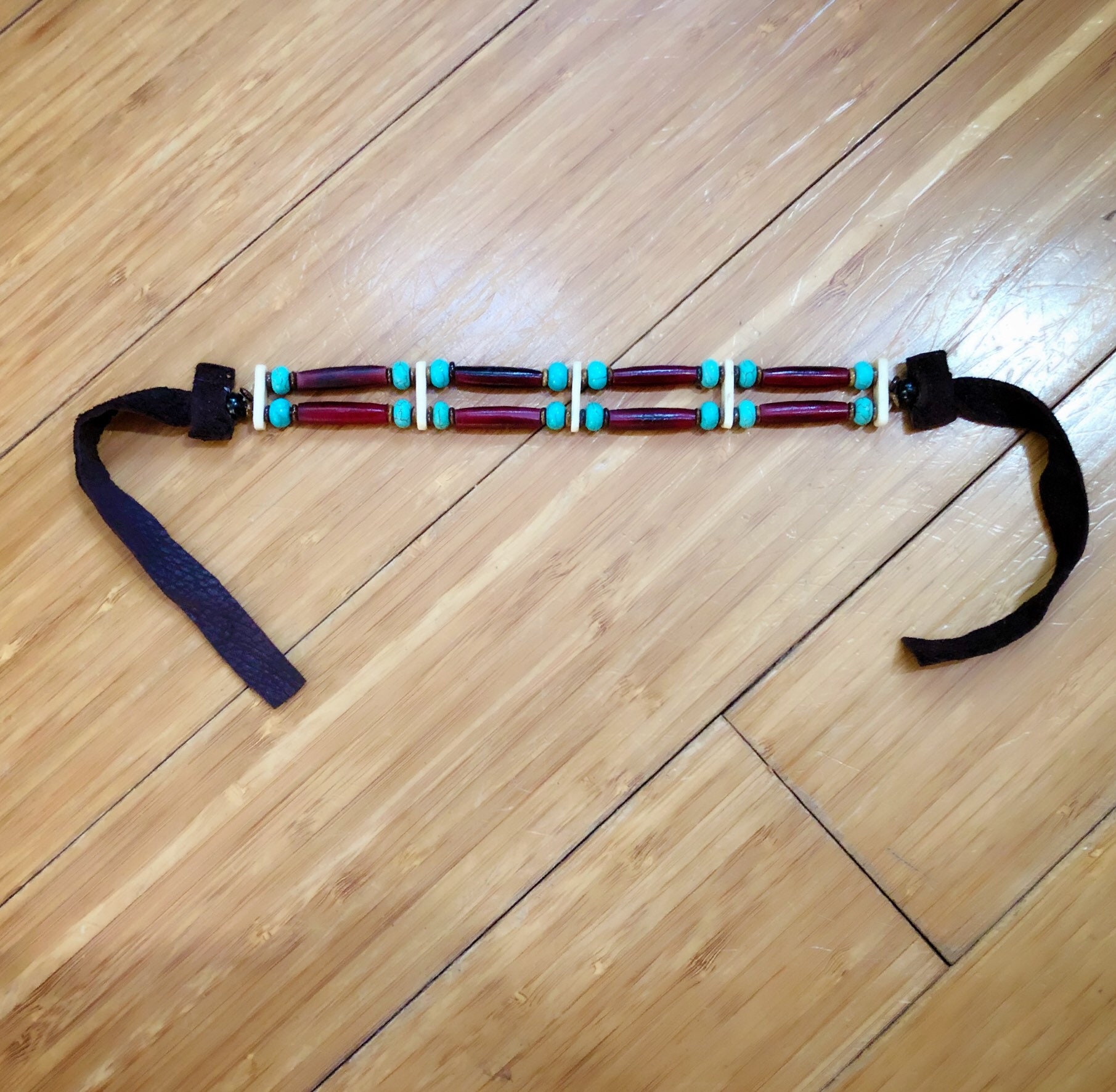 Native American buffalo bone armband. Made with sage blessed beet dyed buffalo bone hair pipes, buffalo bone spacers, turquoise, and traditionally tanned buckskin. Buckskin tie makes this armband adjustable for many sizes. Can be worn as a choker or also as a bracelet.