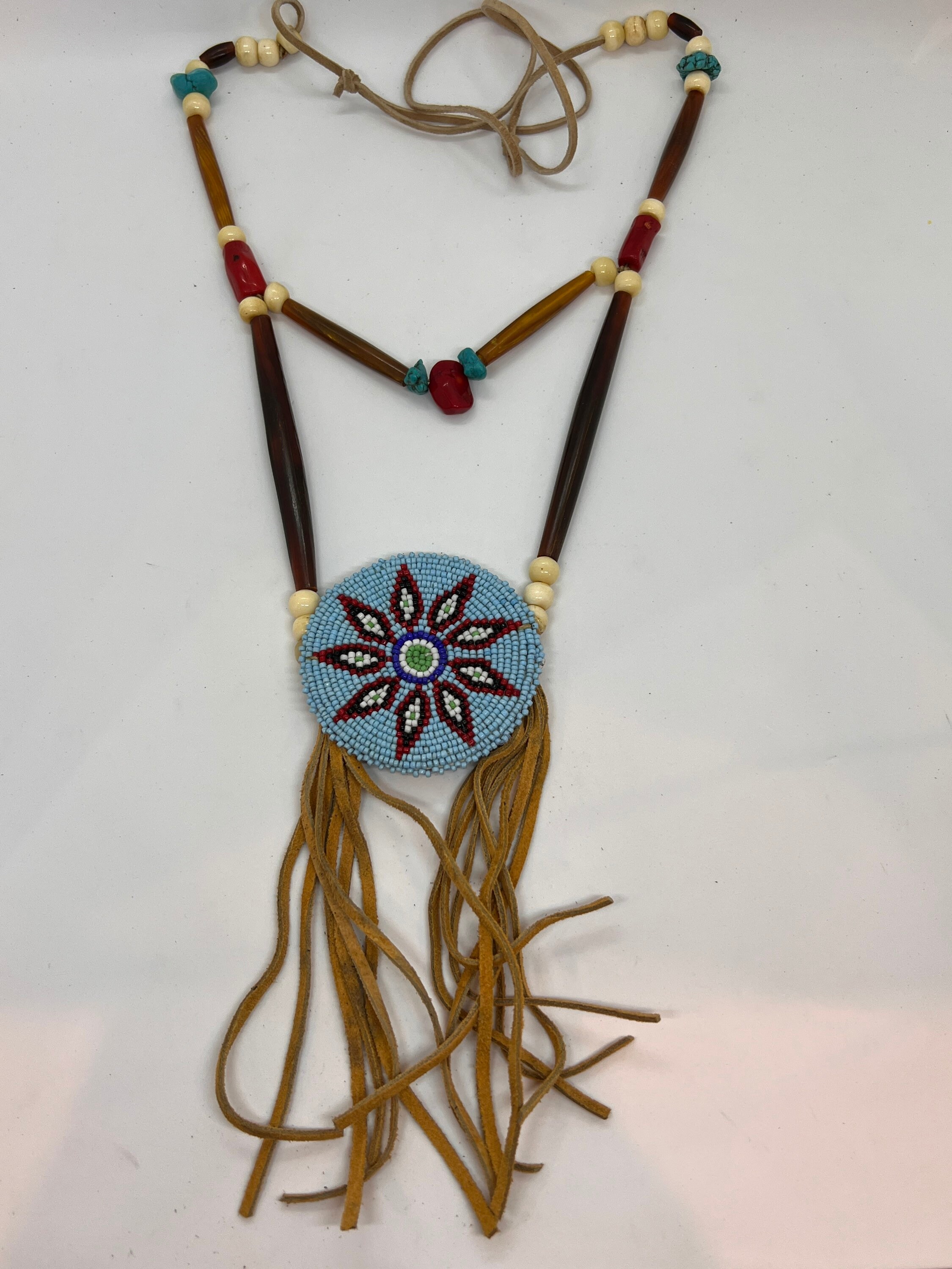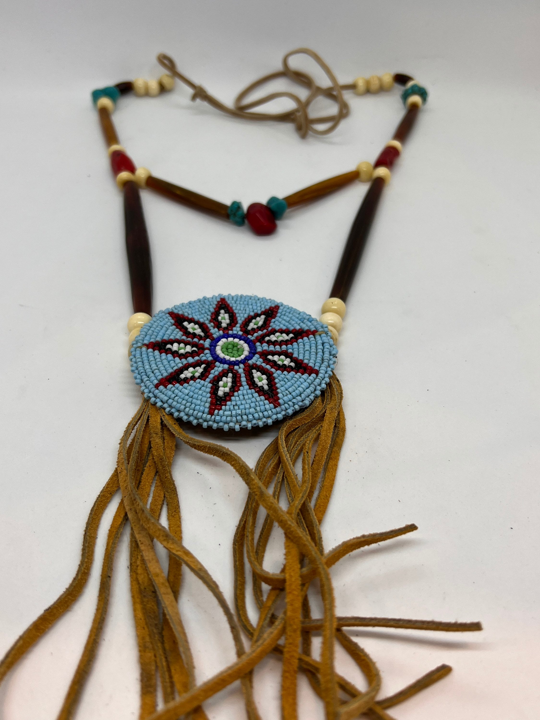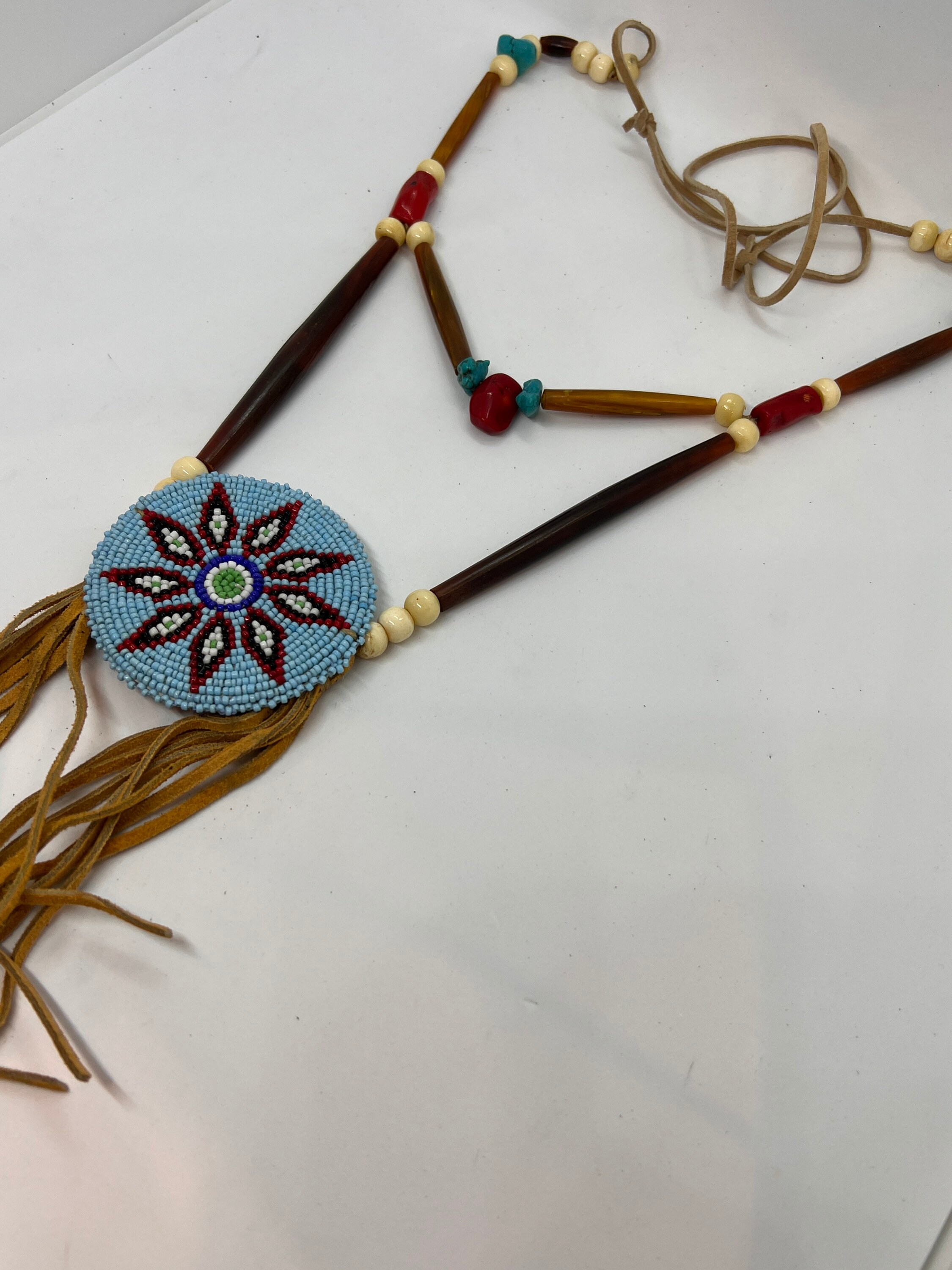 Authentic Native American beaded medallion necklace. This necklace is made with buffalo horn hair pipe beads, buffalo bone beads, glass beadwork, turquoise, and leather. Length of necklace is adjustable with tie.