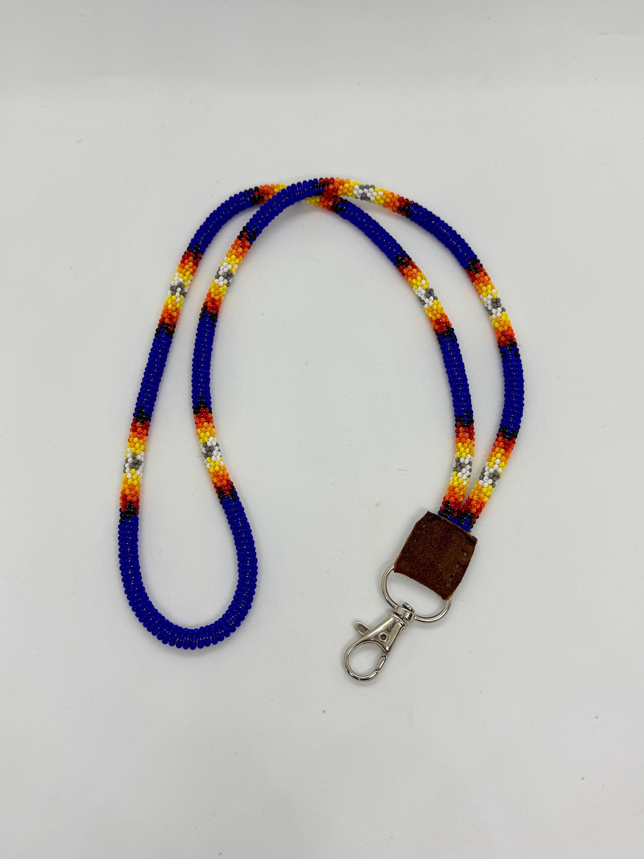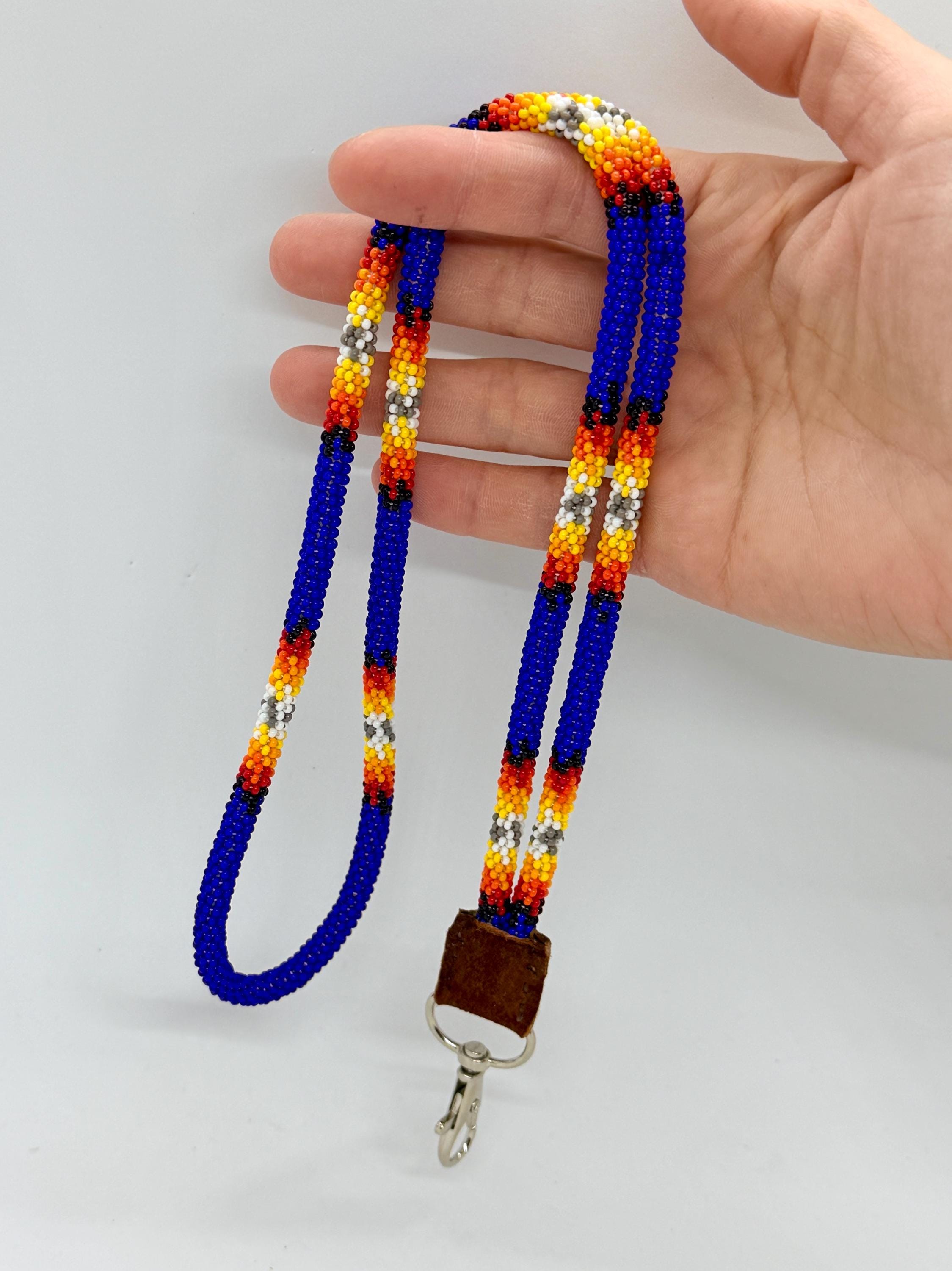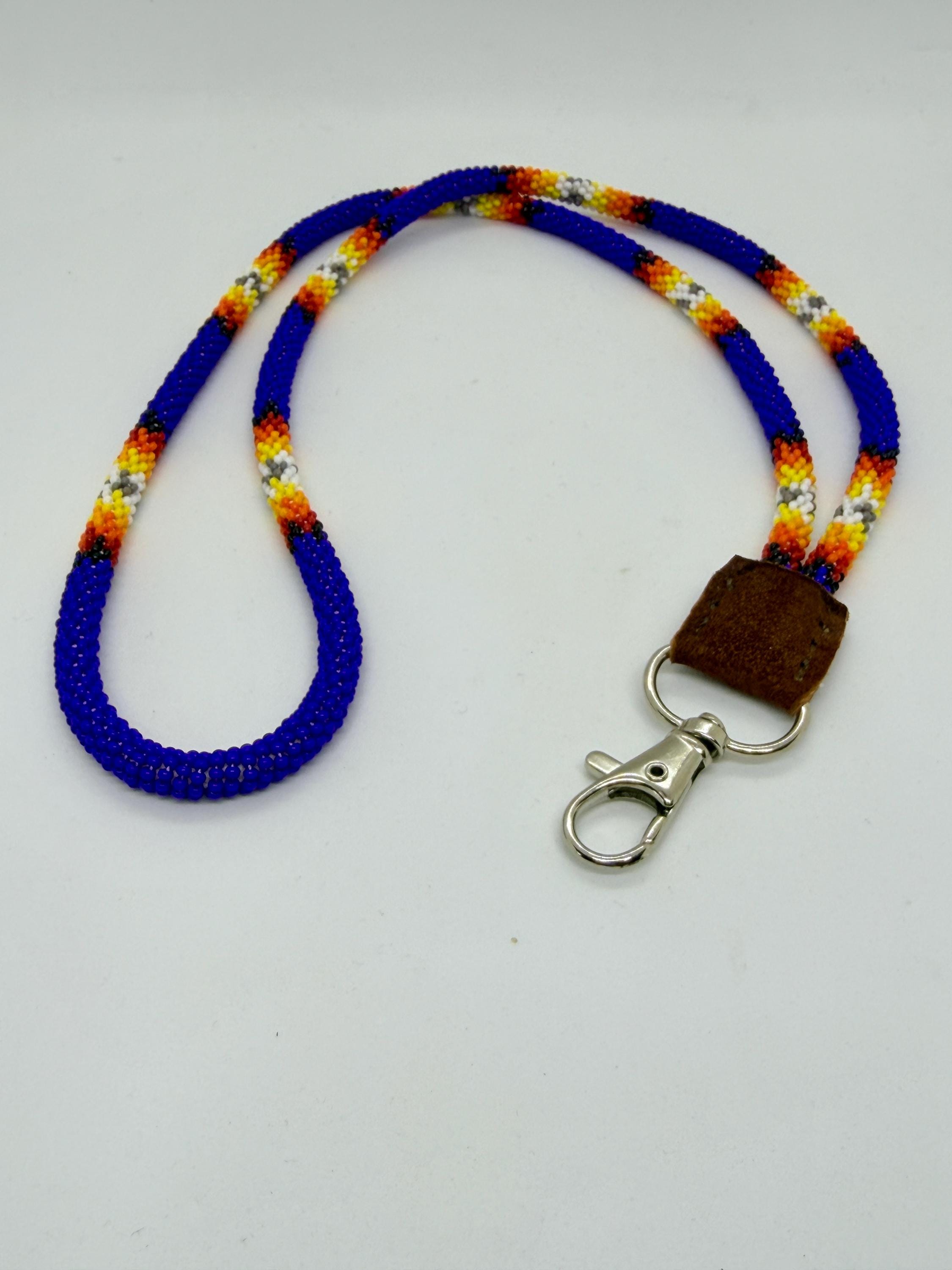 Long handmade beaded lanyard. This lanyard is approximately 31” in total beaded length with the addition length of buckskin and clip. Made with glass beads and super durable nylon thread.